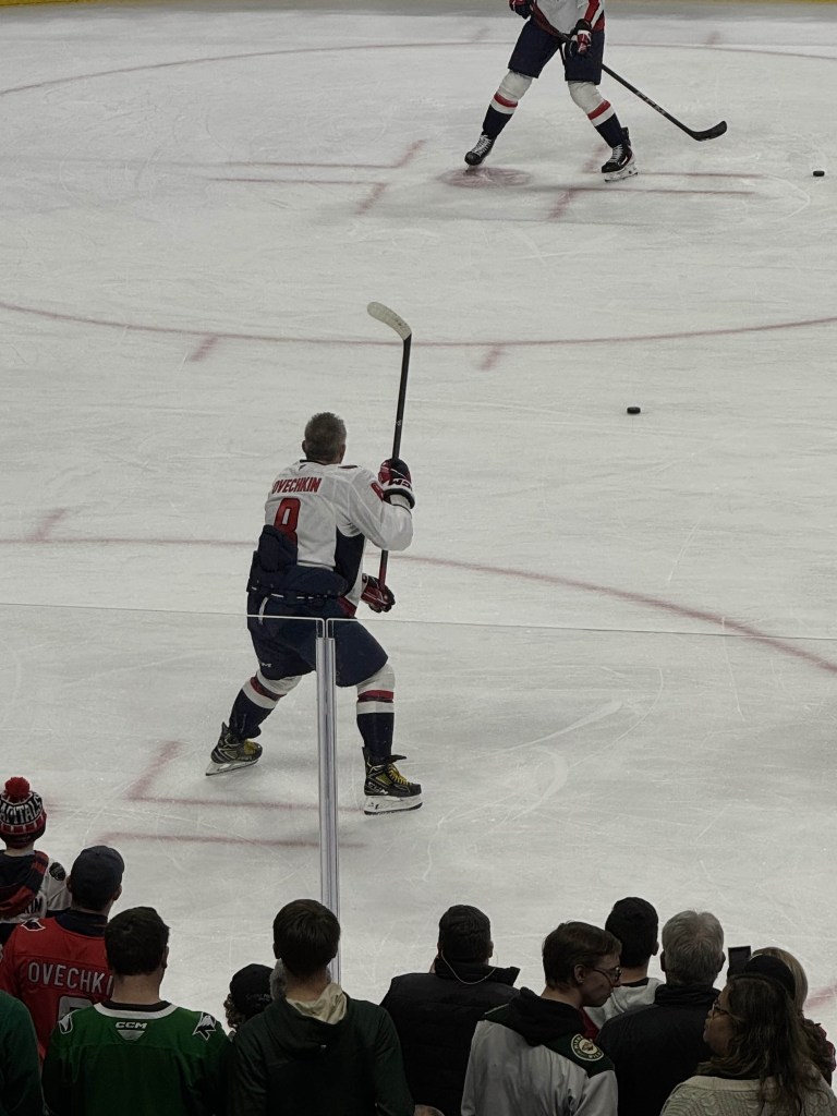 To tell the truth, there was no real reason for us to be at the rink so early aside from my desire to see the players warm up before the game. We got to our seats just in time for the pre-show to start, and I was ecstatic to see players I had been watching for the past few seasons return to the ice and to point out all of my favorites. We sat on the visitors’ side so that I could watch the Capitals players first. The main player I wanted to see was Alexander Ovechkin, who wears number 8 for the team. During the 2024–2025 season, Ovechkin reached and surpassed the all-time regular-season goals record. This title was previously held by Wayne Gretzky, The Great One.