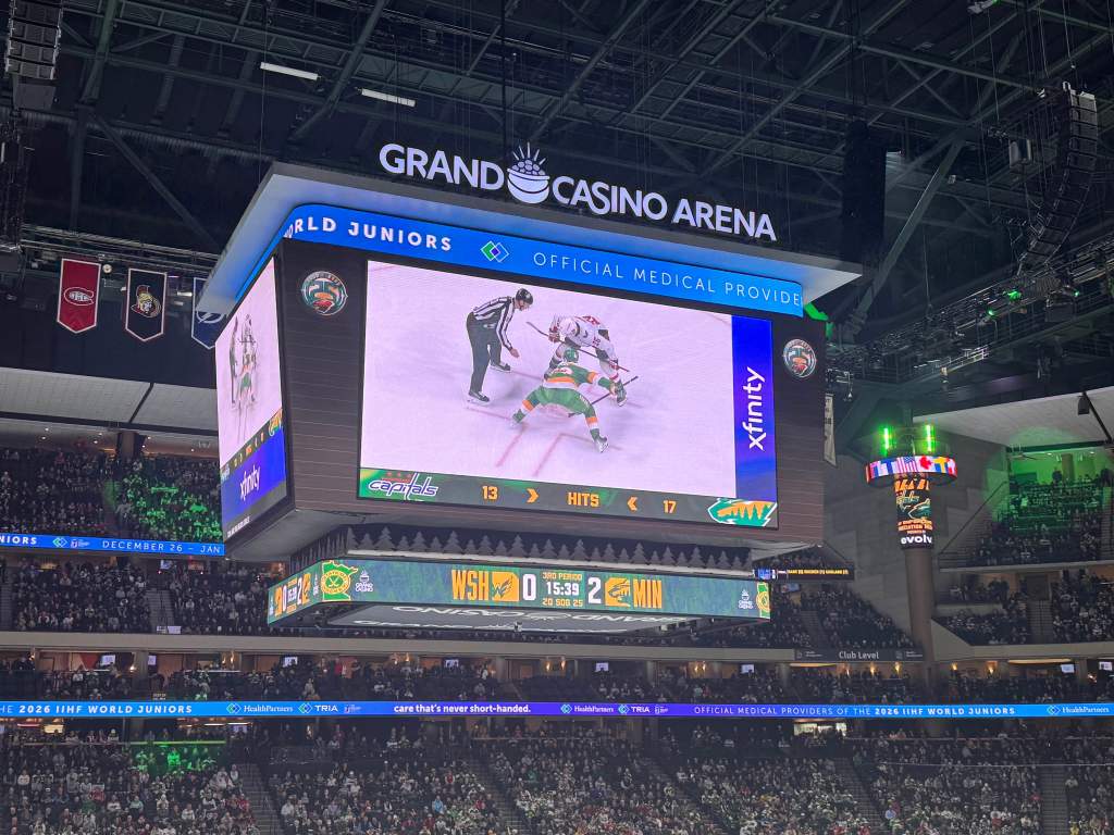 Starting with my entrance into the newly rebranded Grand Casino Arena, formerly the Xcel Energy Center, I was immediately taken back. I had been to the arena many times over the years, but always while it existed under its previous name. The downtown St. Paul area is full of businesses and museums that surround the arena, making it very easy for my party and me to walk from our hotel to dinner before catching warmups at the rink. I was hit with a wave of nostalgia upon opening the doors, reminding me of all the past games I had witnessed and where my life was at during those moments.